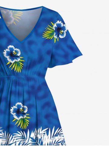 Plus Size Floral Pineapple Tropical Leaves Print Hawaii Ombre Split Pocket A Line Midi Dress - Blue - 1x