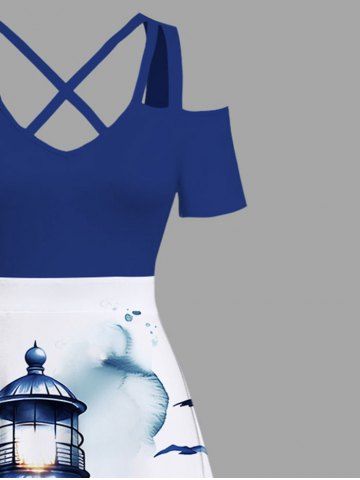 Plus Size Floral Sea Observation Deck Bird Print Hawaii Cold Shoulder Crisscross A Line Maxi Dress - Blue - 3x