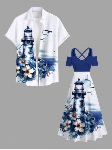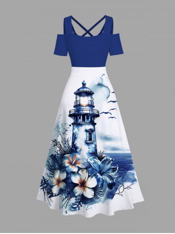 Graphic Dresses > Plus Size Floral Sea Observation Deck Bird Print Hawaii Cold Shoulder Crisscross A Line Maxi Dress