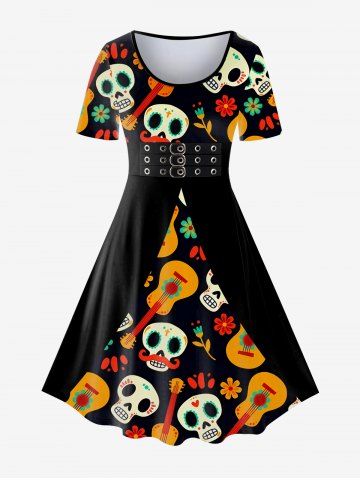 Graphic Dresses > Plus Size Floral Skull Guitar 3D Print Vintage Dress