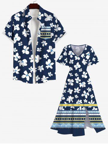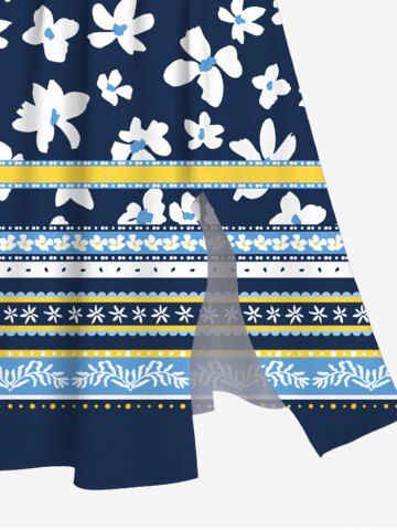 Plus Size Floral Striped Print Hawaii Split Pocket A Line Midi Dress - Midnight Blue - 6x