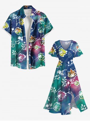 Plus Size Floral Tie Dye Ombre Print Hawaii Split Pocket A Line Midi Dress - Blue - 1x