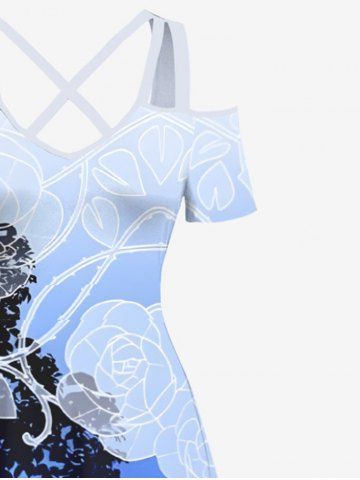 Plus Size Floral Tree Light Beam Heart Leaf Stars Bubble Print Hawaii Crisscross A Line Maxi Dress - Blue - 3x