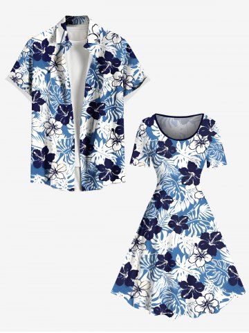 Plus Size Flower Tropical Leaf Print Hawaii A Line Dress - Blue - 3x