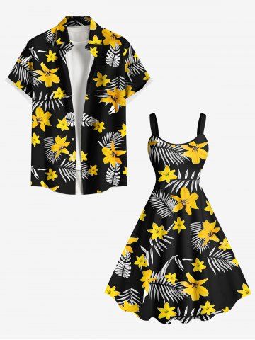 Plus Size Flower Tropical Leaf Print Hawaii A Line Tank Dress - Black - S