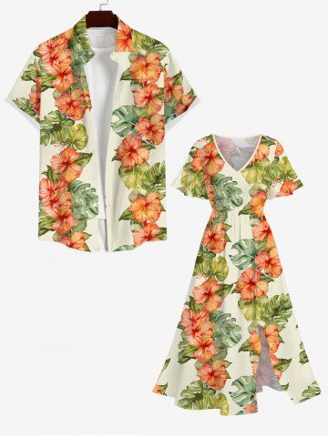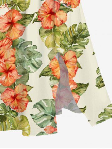 Graphic Dresses > Plus Size Floral Tropical Leaves Print Hawaii Split Pocket A Line Midi Dress