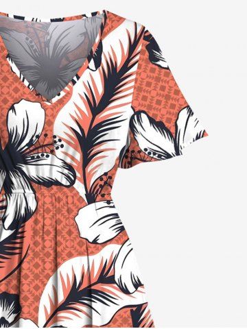 Plus Size Floral Tropical Leaves Print Hawaii Split Pocket A Line Midi Dress - Red - Xxs