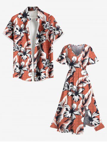 Graphic Dresses > Plus Size Floral Tropical Leaves Print Hawaii Split Pocket A Line Midi Dress