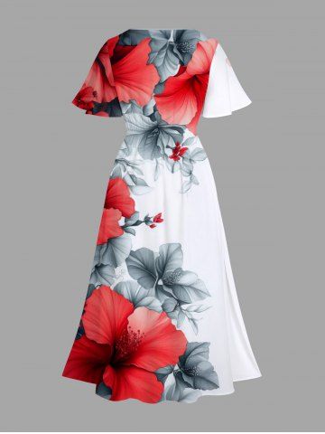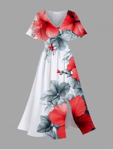 Plus Size Floral Tropical Leaves Print Hawaii Split Pocket A Line Midi Dress - Red - 2x