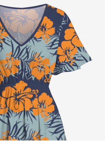 Graphic Dresses > Plus Size Floral Tropical Leaves Striped Print Hawaii Split Pocket A Line Midi Dress