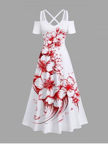 Plus Size Floral Two Tone Print Hawaii Crisscross A Line Maxi Dress - White - 1x