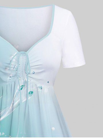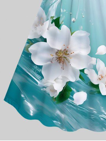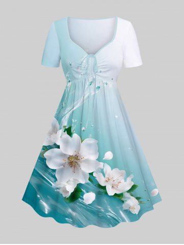 Graphic Dresses > Plus Size Floral Water Flow Print Hawaii Ombre Cinched A Line Dress