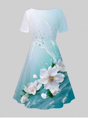 Graphic Dresses > Plus Size Floral Water Flow Print Hawaii Ombre Cinched A Line Dress