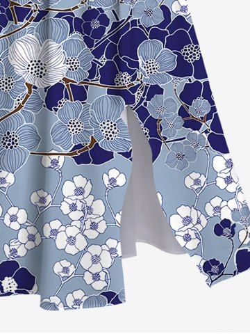 Plus Size Flower Branch Colorblock Print Split Pocket A Line Dress - Blue Gray - 6x