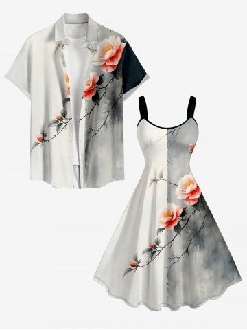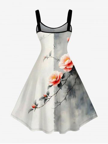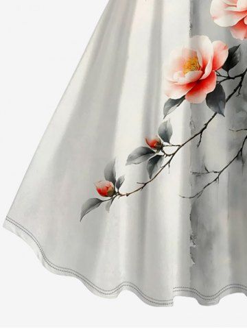Plus Size Flower Branch Ink Painting Print Hawaii A Line Dress - White - 4x
