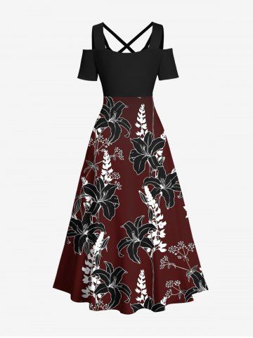 Plus Size Flower Branch Print Hawaii Cold Shoulder Crisscross A Line Maxi Dress - Red Wine - S