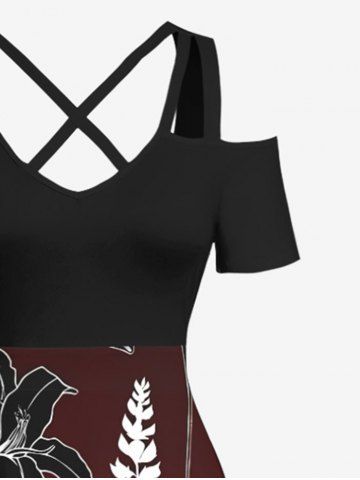Plus Size Flower Branch Print Hawaii Cold Shoulder Crisscross A Line Maxi Dress - Red Wine - 3x