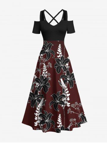 Plus Size Flower Branch Print Hawaii Cold Shoulder Crisscross A Line Maxi Dress - Red Wine - 5x
