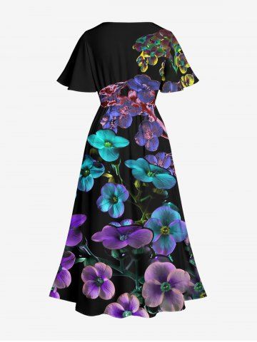 Plus Size Flower Branch Print Hawaii Split Pocket A Line Midi Dress - Concord - S