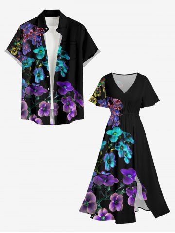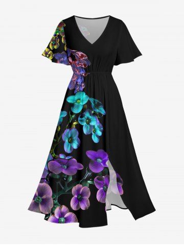 Graphic Dresses > Plus Size Flower Branch Print Hawaii Split Pocket A Line Midi Dress