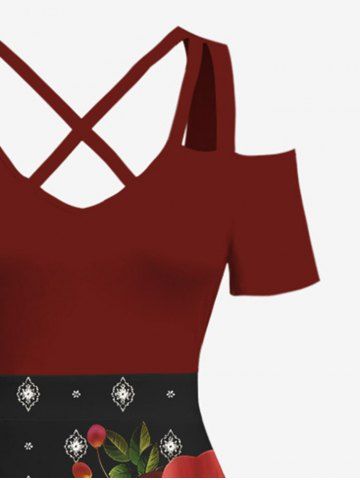 Plus Size Flower Butterfly Eye Print Hawaii Cold Shoulder Crisscross A Line Maxi Dress - Red - 1x