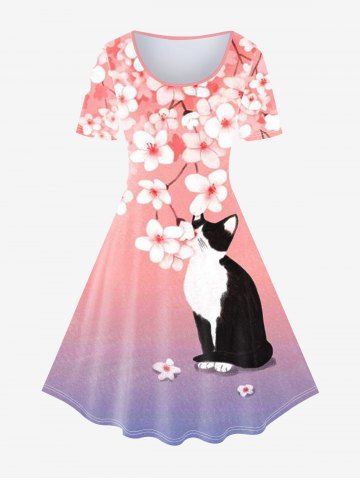 Plus Size Flower Cat Print Ombre A Line Short Sleeve Dress - Light Pink - M