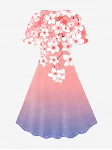 Plus Size Flower Cat Print Ombre A Line Short Sleeve Dress - Light Pink - 6x