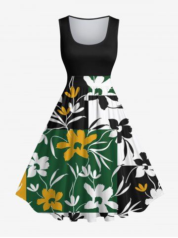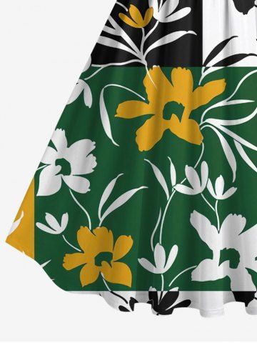 Graphic Dresses > Plus Size Flower Colorblock Print Hawaii Vintage A Line Dress