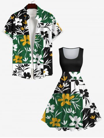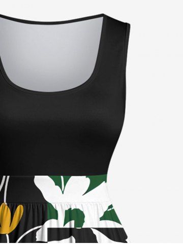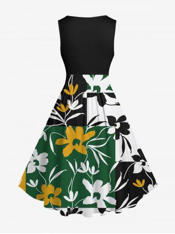 Plus Size Flower Colorblock Print Hawaii Vintage A Line Dress - Black - L