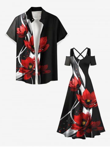 Plus Size Flower Curve Print Cold Shoulder Crisscross Strappy A Line Maxi Dress - Black - 2x