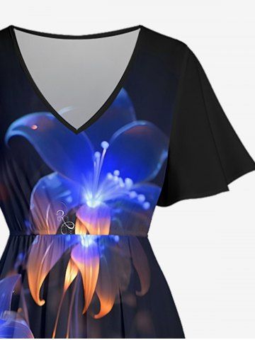 Plus Size Flower Glitter 3D Print Surplice Hawaii Midi Dress - Black - 4x