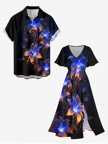 Plus Size Flower Glitter 3D Print Surplice Hawaii Midi Dress - Black - 6x