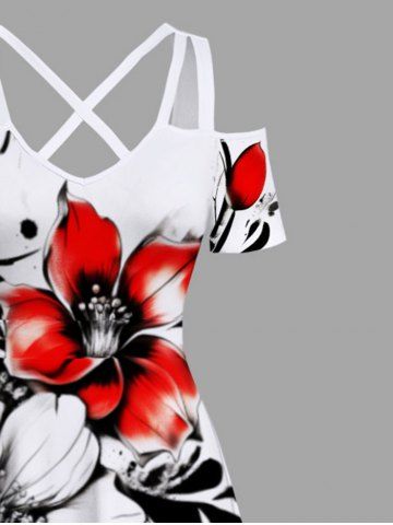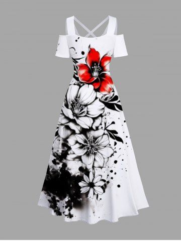 Plus Size Flower Ink Painting Splatter Print Cold Shoulder Crisscross Hawaii Maxi Dress - White - S