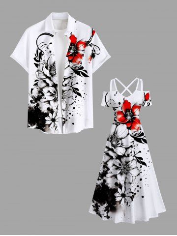 Plus Size Flower Ink Painting Splatter Print Cold Shoulder Crisscross Hawaii Maxi Dress - White - 3x