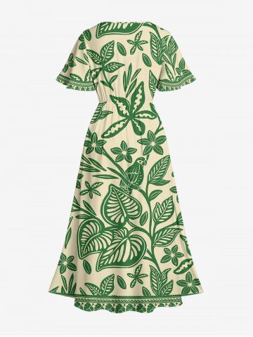 Plus Size Flower Leaf Bird Print Hawaii Split Pocket A Line Midi Dress - Green - Xs