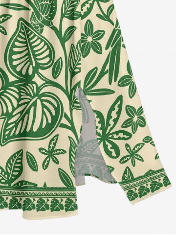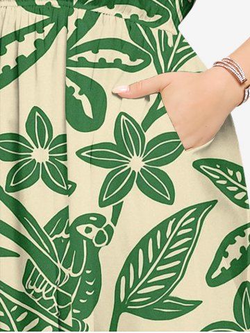 Plus Size Flower Leaf Bird Print Hawaii Split Pocket A Line Midi Dress - Green - 6x