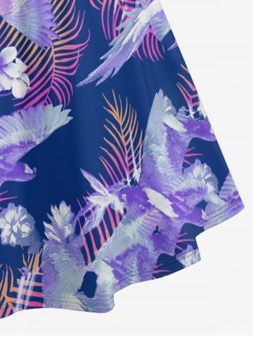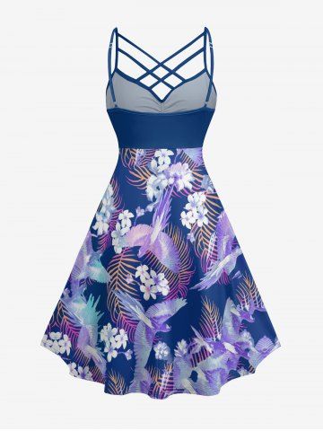 Plus Size Flower Leaf Bird Tropical Print Ruched Lattice Crisscross Straps Hawaii Dress - Purple - M