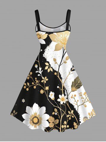 Plus Size Flower Leaf Branch Contrast Colorblock Print Hawaii A Line Dress - Black - Xxs