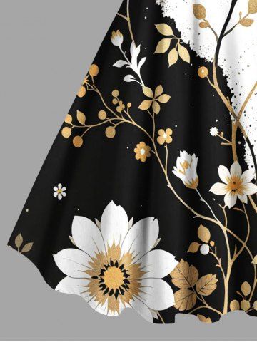 Plus Size Flower Leaf Branch Contrast Colorblock Print Hawaii A Line Dress - Black - L