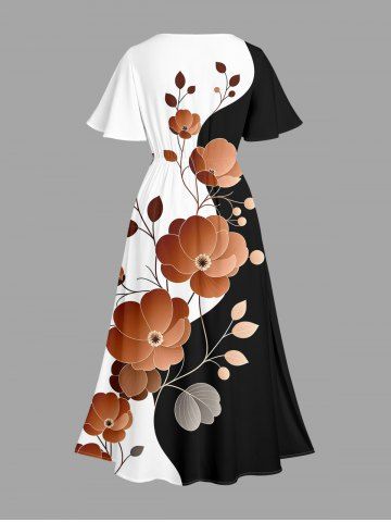 Plus Size Flower Leaf Branch Contrast Colorblock Print Hawaii Split Pocket A Line Midi Dress - Black - 1x