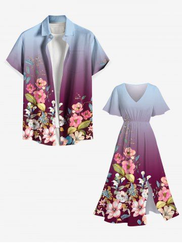 Plus Size Flower Leaf Branch Dip Dye Ombre Print Hawaii Split Pocket A Line Midi Dress - Purple - L