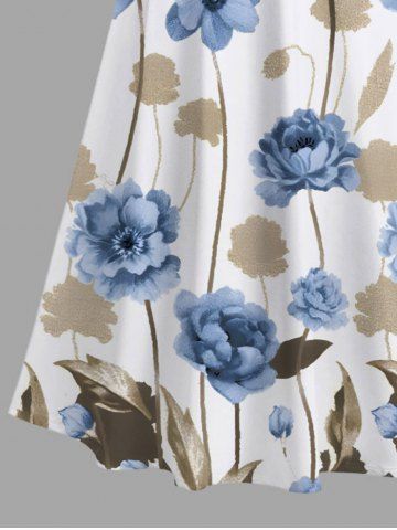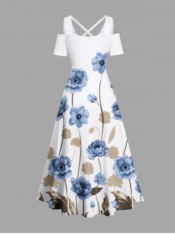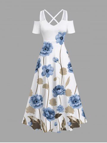 Graphic Dresses > Plus Size Flower Leaf Branch Print Hawaii Cold Shoulder Crisscross A Line Maxi Dress