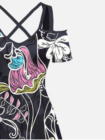 Plus Size Flower Leaf Branch Print Hawaii Cold Shoulder Crisscross A Line Maxi Dress - Black - Xs