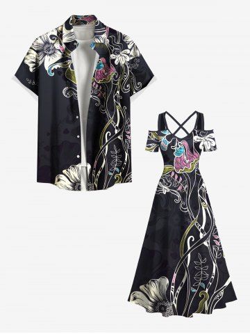 Plus Size Flower Leaf Branch Print Hawaii Cold Shoulder Crisscross A Line Maxi Dress - Black - 6x