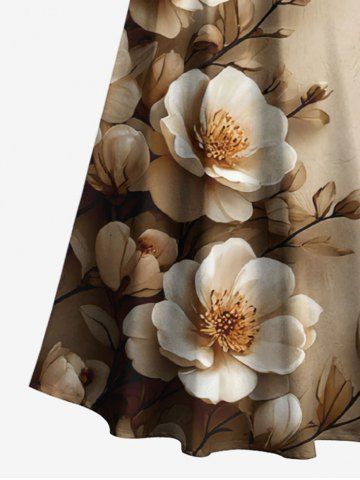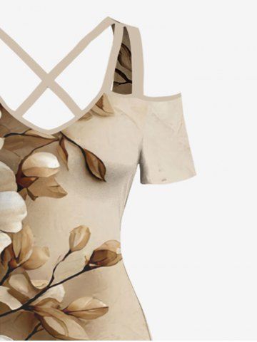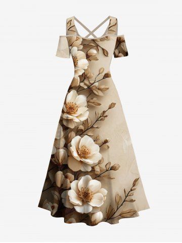 Plus Size Flower Leaf Branch Print Hawaii Cold Shoulder Crisscross A Line Maxi Dress - Light Coffee - Xxs