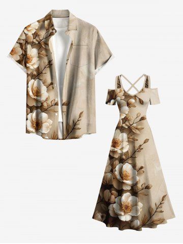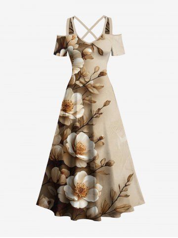 Plus Size Flower Leaf Branch Print Hawaii Cold Shoulder Crisscross A Line Maxi Dress - Light Coffee - Xs