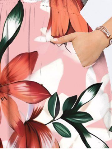Plus Size Flower Leaf Branch Print Hawaii Split A Line Midi Dress - Light Pink - M