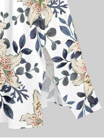 Plus Size Flower Leaf Branch Print Hawaii Split Pocket A Line Midi Dress - White - Xxs