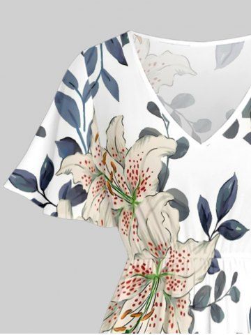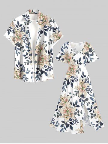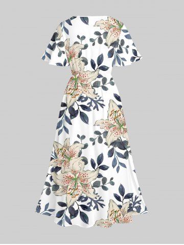 Plus Size Flower Leaf Branch Print Hawaii Split Pocket A Line Midi Dress - White - Xs