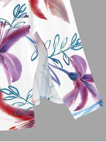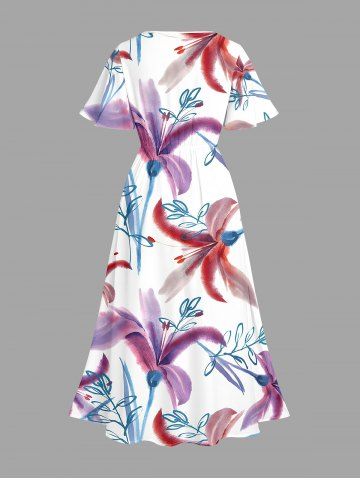 Plus Size Flower Leaf Branch Print Hawaii Split Pocket A Line Midi Dress - White - Xxs